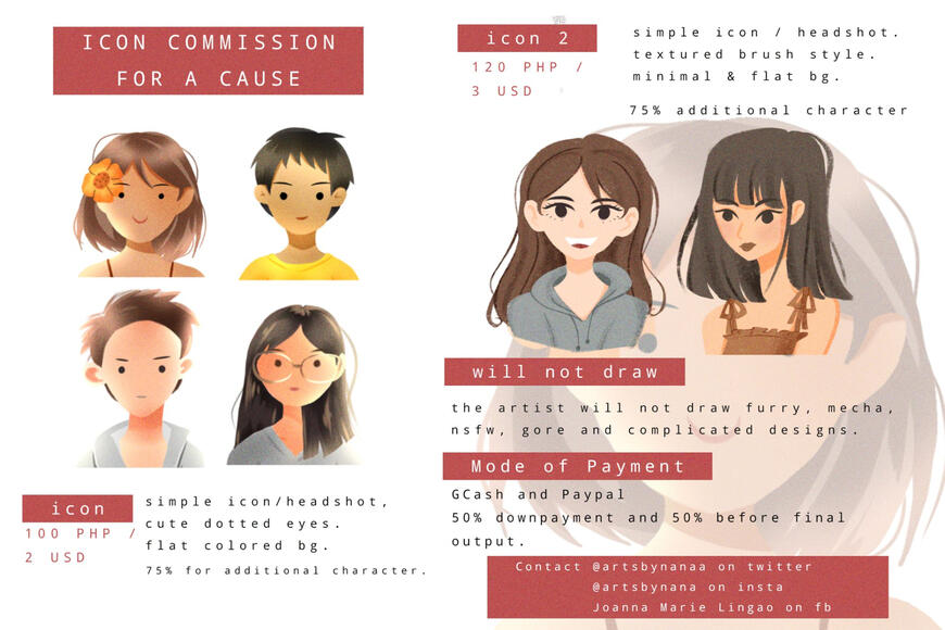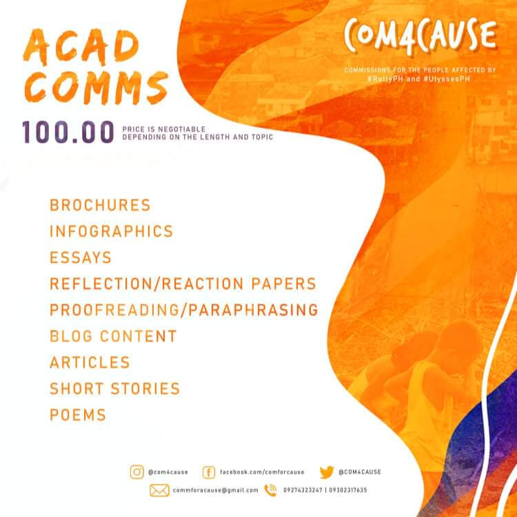 As a general rule, each artist may have specific rules already stated in their commission sheets which must be honored. This will include art they won't commission to make or rules for copyright and distribution of their art.Artists reserve copyright for their work, this means no removing their watermark or signature when reposting paid commissions.For traditional art pieces, please note that shipping fee must be shouldered by the client if the location you need it sent to is not within the area specified for meet ups.Payment must be made before our artist/writers start on any piece. A minimum of 50% payment must be confirmed upfront and the remaining percentage must be given before the work can be claimed.For academic help, if you're commissioning for modules, a maximum of 2 modules can be commissioned per client at one time.For written works, such as essays, poems, articles, and etc., the price range will vary depending on the topic and length of work. This will then be based on the information you will provide upon messaging our page.COM4CAUSE will distribute acad and written commissions to the volunteers based on their credentials, unless otherwise the client have a specific person in mind to write their commissions.